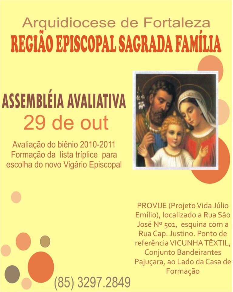 Assembléia Região Episcopal Sagrada FamíliaDia 29 de outubroLocal: Projeto Vida Júlio Emílio, localizado a Rua São José, 501. Esquina com a Rua Cap. Justino, Ponto de referência VICUNHA TÊXTIL, Conjunto Bandeirantes Pajuçara, ao lado da Casa de Formação. [MAPA]Informações: (85) 3297.2849 – 8635.2749 (falar com Gleiciane Ferrer)