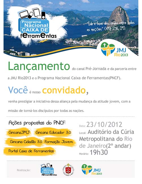 O Portal oficial da Jornada Mundial da Juventude dará início ao canal Pré-Jornada. Neste mesmo dia, a JMJ Rio2013, o Programa Nacional Caixa de Ferramenta (PNCF) e as mídias sociais da Arquidiocese do Rio Janeiro lançarão uma parceria de ação catequética. O evento acontecerá em 23 de outubro, no auditório do Edifício João Paulo II (Rua Benjamim Constant, 23, Glória – RJ). O intuito é apresentar visibilidade ao canal e promover a evangelização da juventude, por meio de plataformas tecnológicas de entretenimento e formação aos jovens.