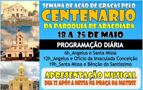 A Paróquia de Aracoiaba celebrará uma semana de Ação de Graças pelos cem anos de criação. Com início no domingo, 18 de maio e encerramento em 25 de maio, a semana será marcada por momentos celebrativos e orantes trazendo à memória a caminhada de um século de evangelização e presença entre o povo aracoiabense.