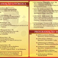 Todos os dias, as celebrações litúrgicas trabalham um tema específico, tais como: Paz, Juventude, Família, Vocação, Dízimo, Maria Mãe de Deus, Eucaristia, Missão e Crianças. Na parte social, além da quermesse, todas as noites são abrilhantadas com uma atração musical, com a Festa dos anos 60. Participe!