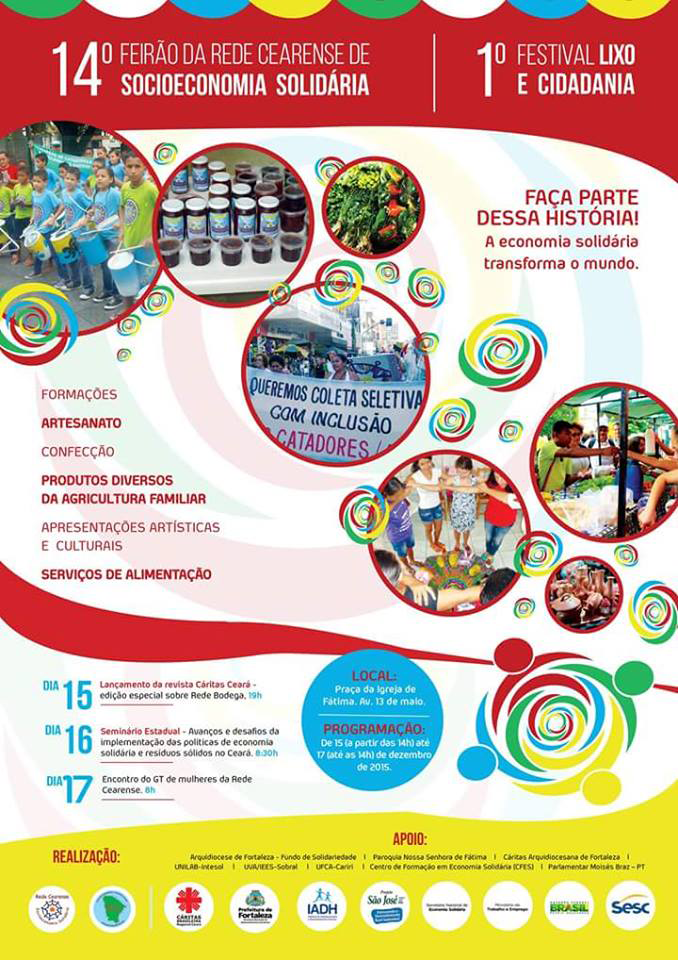 Participe do 14º Feirão de Economia Solidária e 1º Festival Lixo e Cidadania! O evento acontecerá, a partir das 14 horas, nos dias 15,16 e 17 de maio na praça da igreja de Fátima, na Av. 13 de Maio, em Fortaleza.