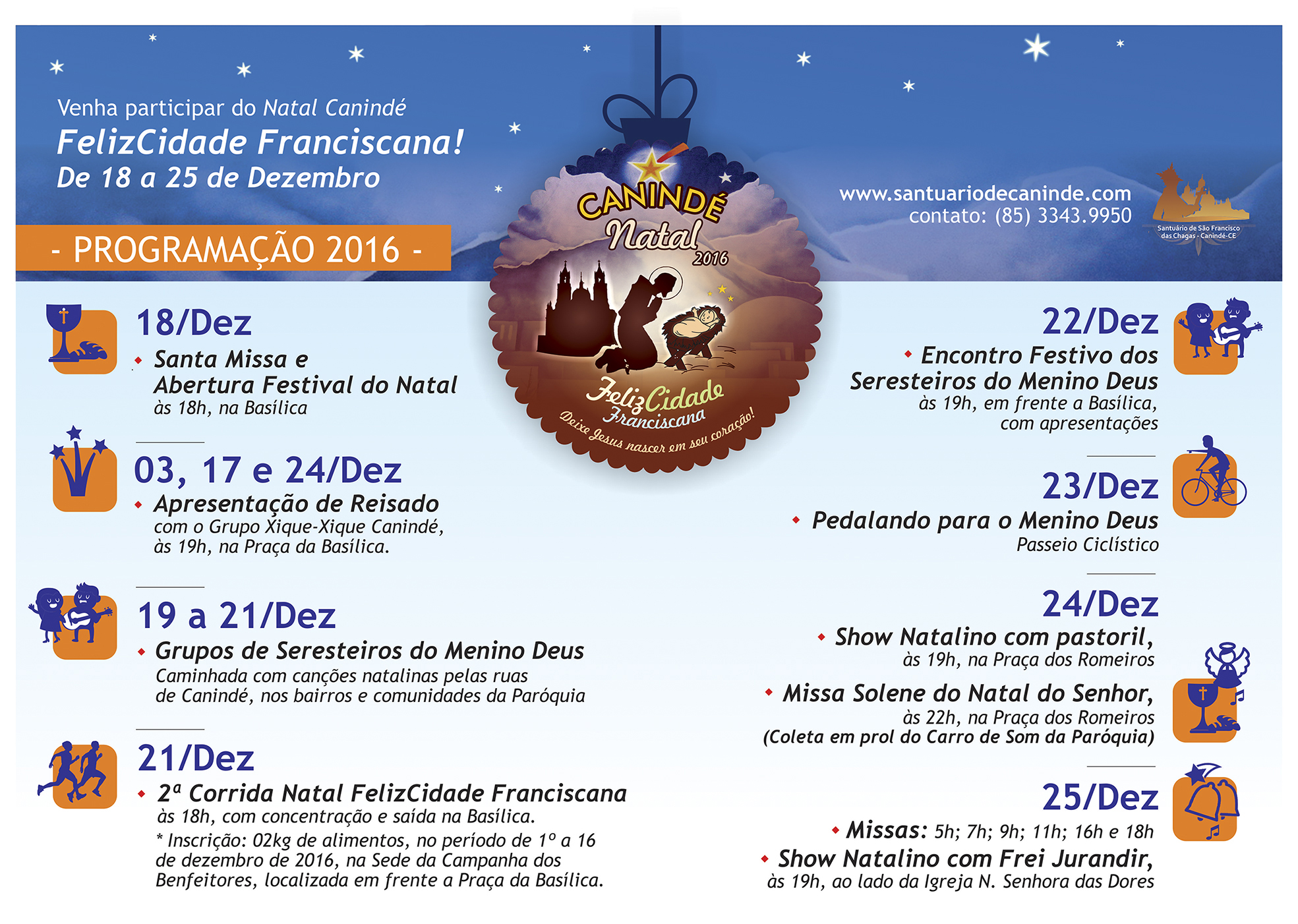 O Santuário e Paróquia de São Francisco das Chagas de Canindé se prepara para realizar mais um ano a programação do Natal FelizCidade Franciscana 2016, para celebrarmos o nascimento de Jesus Cristo, no Natal do Senhor.