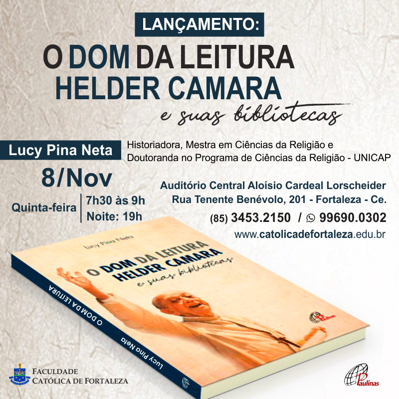 A Faculdade Católica de Fortaleza – FCF convida a comunidade em geral para o lançamento do livro “O DOM DA LEITURA HELDER CAMARA e suas bibliotecas”, recém lançado pela Paulinas Livraria. A autora é Lucy Pina Neta*, uma exímia historiadora e conhecedora das fontes literárias de Dom Helder. Ela convida o leitor a passear por entre as estantes deste que foi um dos grandes prelados do Brasil. Não se trata apenas de conhecer as fontes de informações, mas conhecer a pessoa, a personalidade e os traços proféticos do Bispo Helder Camara.