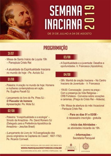 No dia 31 de julho, às 19h deu-se a abertura da Semana Inaciana 2O19 na Paróquia Cristo Rei (Fortaleza), onde servem os jesuítas. A Missa foi presidida pelo Pe. Acrizio SJ, Superior da Plataforma Ceará, com o tema: “A atualidade da Espiritualidade Inaciana”. A Semana Inaciana prossegue até o dia 04 de agosto, no bairro Aldeota. Após a Missa o pároco, Pe. Laércio SJ, convidou a todos para um lanche no espaço paroquial.